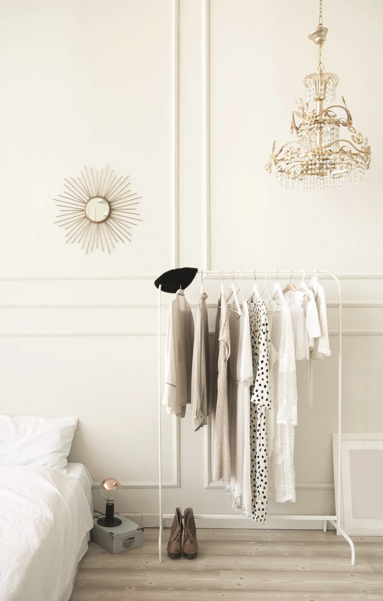 Ściana o odcieniu off white urzeka efektownym minimalizmem, na pierwszy plan wysuwając urok detalu. Kremowy odcień Bone z palety Tikkurila Optiva White zapewni w sypialni dużo ciepła i przytulności, a inspirowane wystawnymi salonami złocone dekoracje, np. finezyjny żyrandol z kryształkami czy okrągłe lusterko naścienne o intrygującym wzorze, wprowadzą delikatny powiew luksusu i wytworności do wnętrza.
