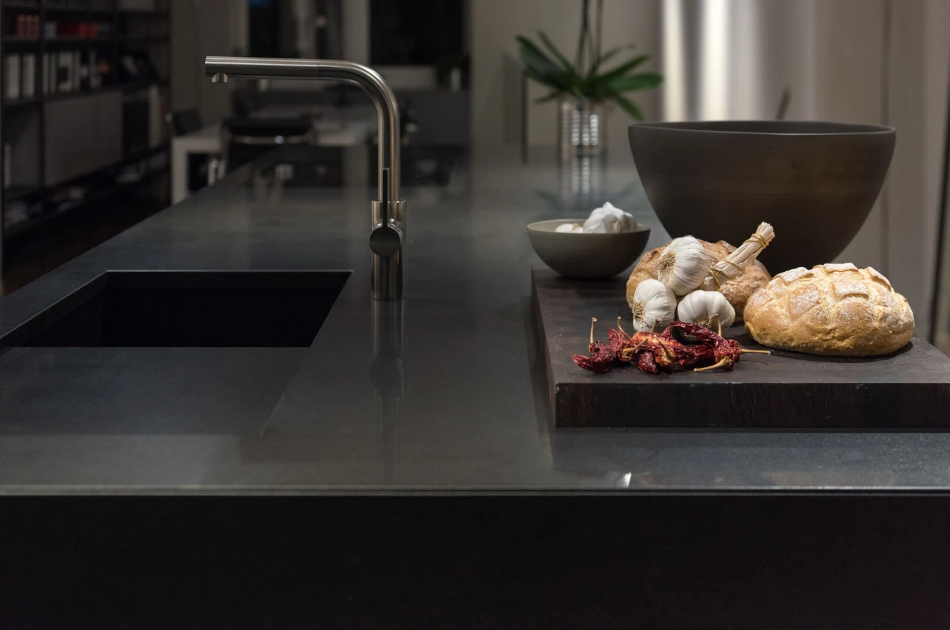 - Dzięki dodatkowi żywicy konglomerat zyskuje pewną elastyczność, której nie mają na przykład blaty z kamienia naturalnego i płytek ceramicznych. Dodatkowo dzięki tej cesze materiał jest prostszy w obróbce, więc możemy nadać mu wiele kształtów i połączyć ze zlewozmywakiem stworzonym z tego samego tworzywa.