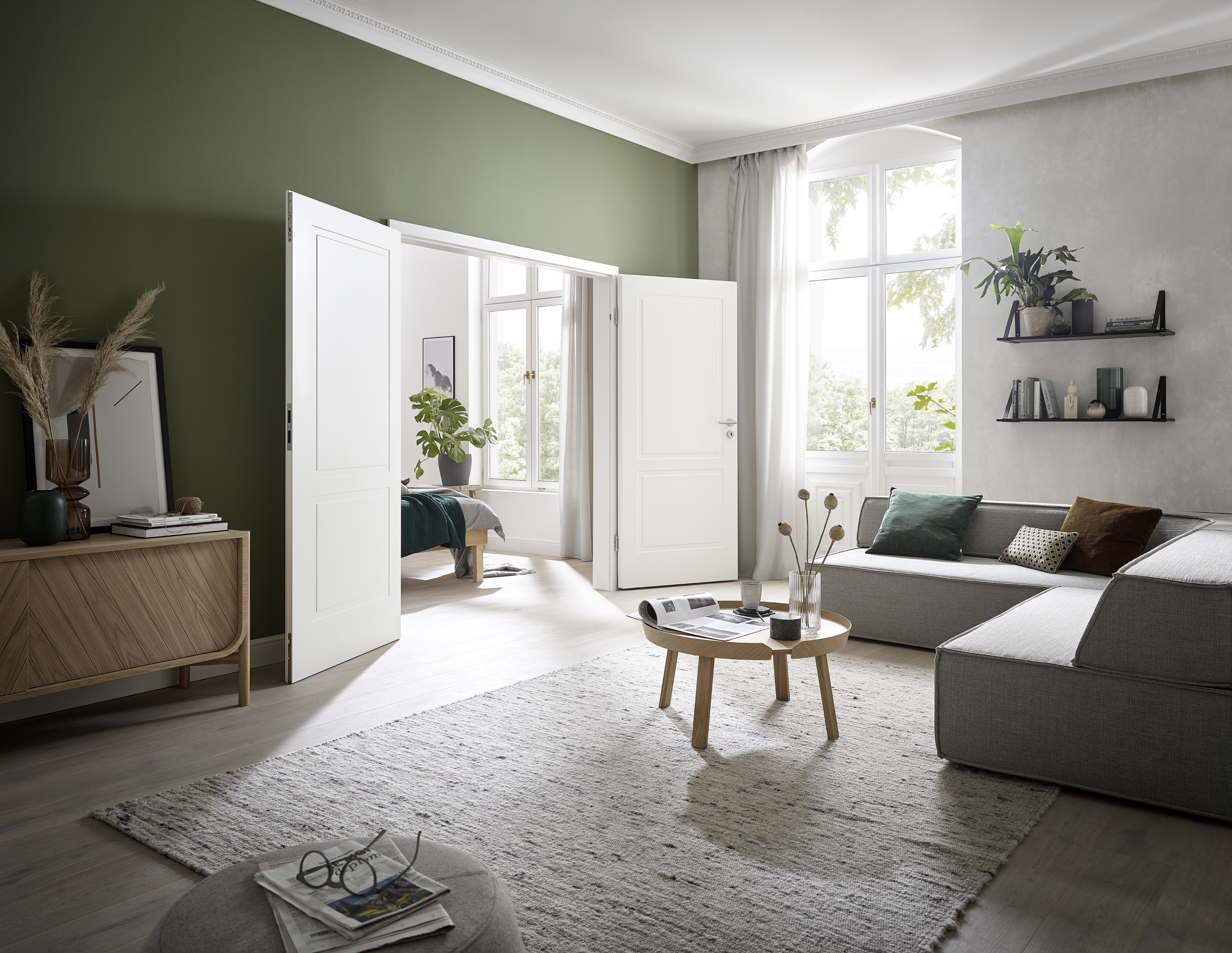 Poza wersją kolorystyczną należy zdecydować się również na model z przylgą lub bez. Drzwi przylgowe mają charakterystyczny uskok – wcięcie na krawędzi skrzydeł, nachodzące po zamknięciu na ościeżnicę. Takie rozwiązanie sprawdza się we wnętrzach w stylu vintage i rustykalnych. Z kolei drzwi bezprzylgowe po zamknięciu tworzą płaską powierzchnię z ościeżnicą. Wraz z ukrytymi zawiasami nadają pomieszczeniom nowoczesny wygląd. Świetnie sprawdzają się zatem w minimalistycznych, nieco surowych wnętrzach. Obydwa typy drzwi znajdują się w ofercie marki Hörmann.