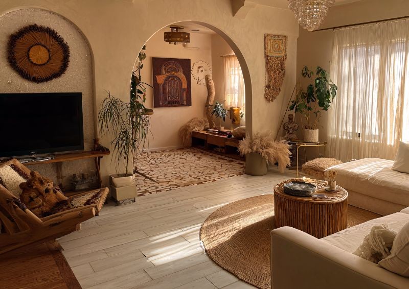 W polskim klimacie zimna podłoga z terakoty lub kamienia może być niepraktyczna przez większą część roku. Dobrym rozwiązaniem jest zastosowanie drewnianej podłogi lub płytek gresowych imitujących kamień, z opcją montażu ogrzewania podłogowego. W salonie postaw na jasne kolory ścian, które rozświetlą wnętrze podczas szarych, pochmurnych dni. Warto również zadbać o odpowiednie oświetlenie – lampy z naturalnych materiałów, takich jak rattan czy len, wprowadzą ciepłą atmosferę.