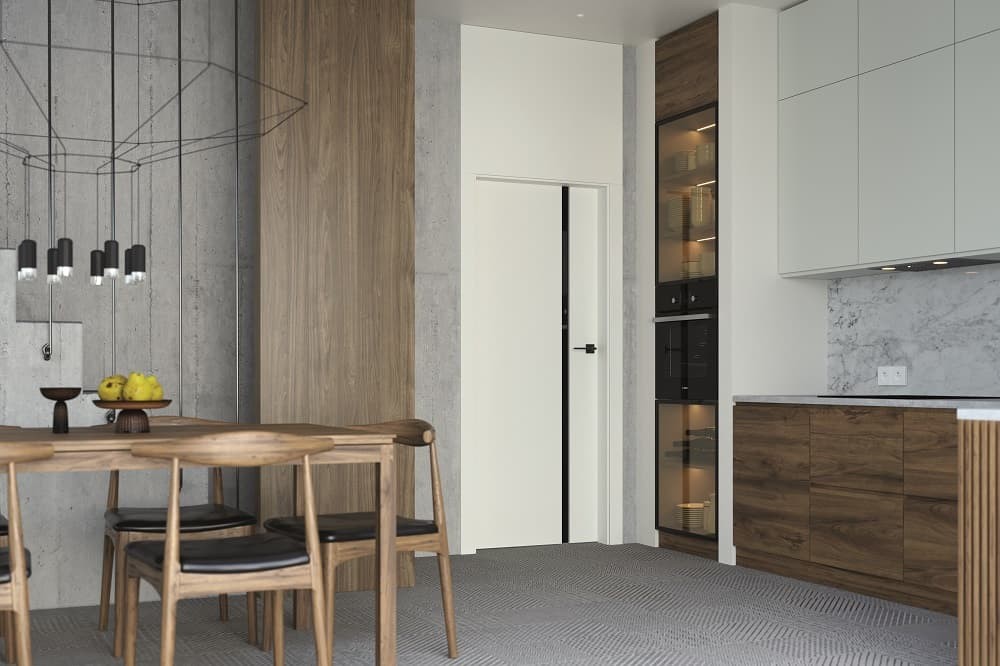Modele I.1 i L.1 z kolekcji PORTA LINE to przykłady gładkich drzwi wewnętrznych, które będą świetnie wyglądać w nowoczesnym wnętrzu. Okleina w szarym kolorze sprawi, że wspomniane modele sprawdzą się również w industrialnych i skandynawskich wnętrzach. Modele I.1 i H.1 zdobią subtelne intarsje – to dodatkowy element ozdobny, dzięki któremu drzwi zyskują elegancki design. W modelu H.1 mamy jedną intarsję, która przechodzi pionowo przez środek drzwi. W modeli I.1 intarsje są zarówno pionowe, jak i poziome.