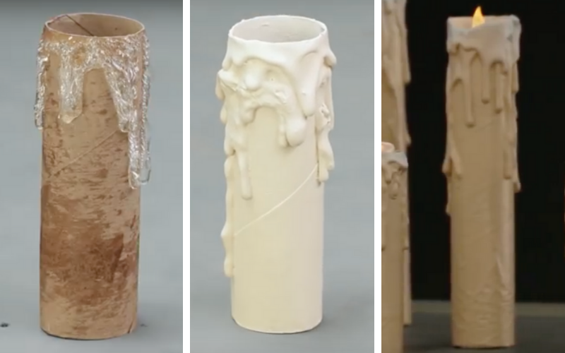 Do wykonania lewitujących świec potrzebne ci będą: rolki po papierze toaletowym, biała farba, plastikowe tealighty, przezroczysta żyłka, igła i klej na gorąco. Na rolkach „narysuj” klejem strużki ociekającego wosku, użyj go także do wykonania półeczki, która będzie podtrzymywała plastikową świecę na takiej wysokości, aby wystawał tylko „płomień”. Wykonaj igłą dwie małe dziurki, tuż pod plastikową świeczką, po obu stronach rolki, przewlecz żyłkę. Zawieś świeczki na różnych wysokościach - będą wyglądały, jakby lewitowały!