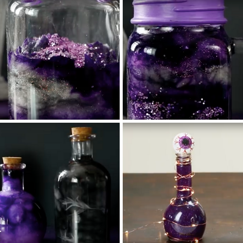 Kolorowe eliksiry w pękatych flakonach wyglądają ciekawie i magicznie. Do ich przygotowania potrzebne ci będą: słoje, flakony i inne naczynia o nietypowych kształtach, woda, barwniki spożywcze, wata kosmetyczna, brokat i opcjonalnie pióra, druciki.