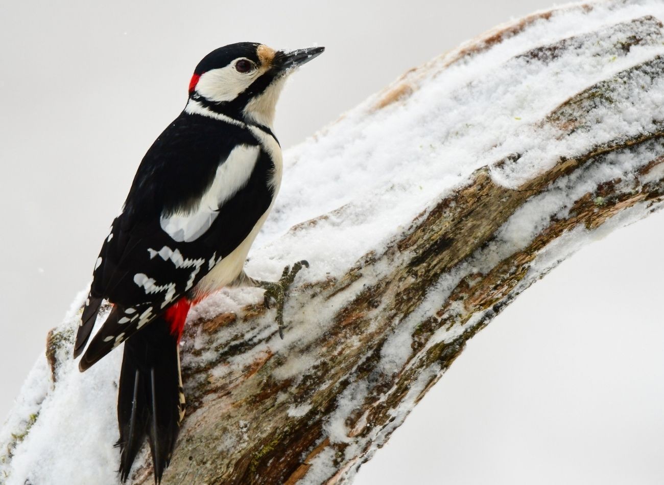 Dzięcioł pstry ma czarno-białe upierzenie z czerwonymi akcentami na podbrzuszu lub głowie w formie pręg i czapeczek. Fot. Szymon Bartosz/123RF.com