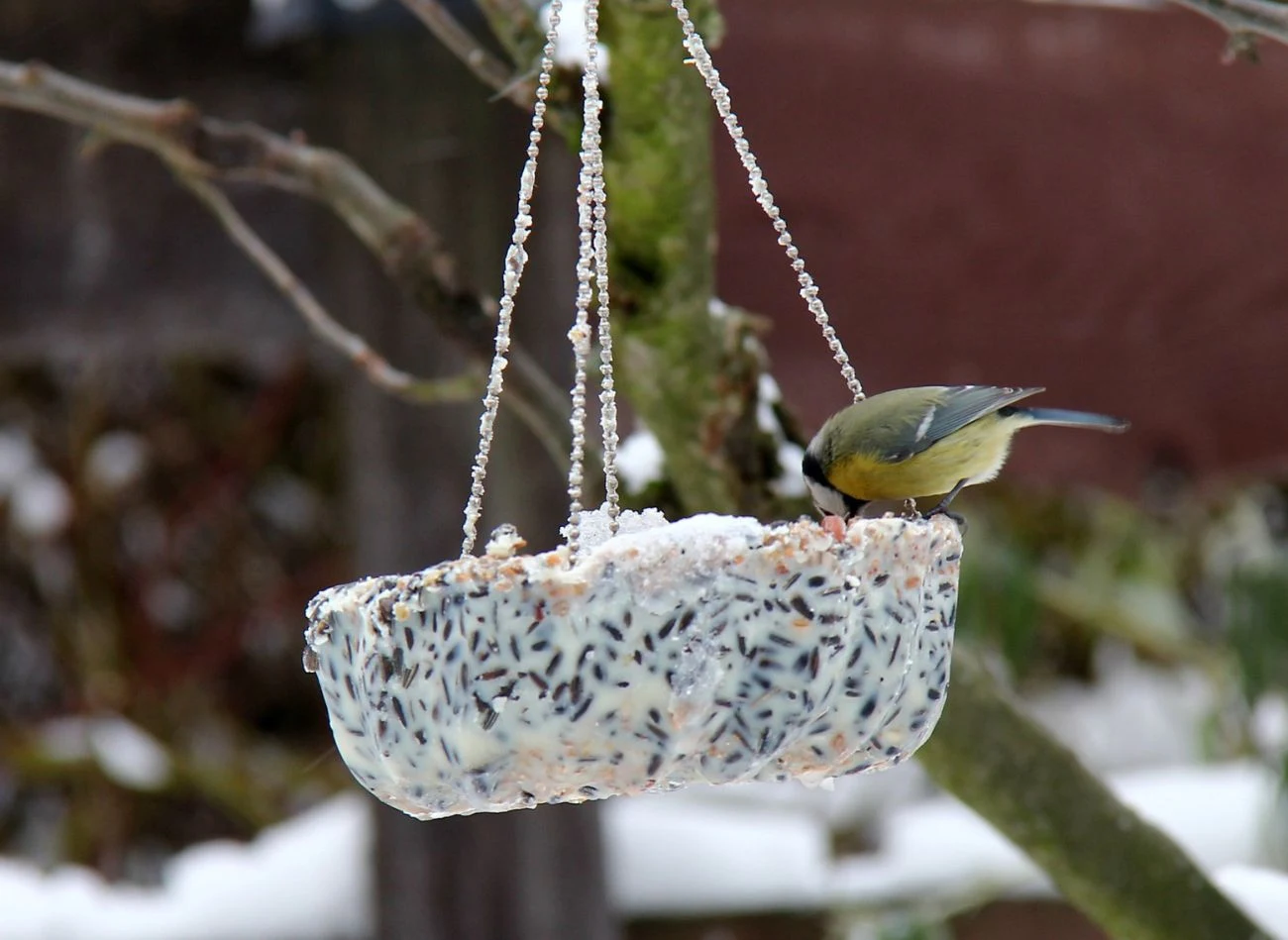 Ptaki spożywają również tłuszcz w formie bloków lub kul. To dla nich doskonałe źródło energii, szczególnie w trakcie mroźnej zimy. Najlepszy będzie dla nich tłuszcz zwierzęcy, na przykład smalec lub słonina – oczywiście bez dodatku soli. Nada się również łój wołowy. Jeśli chcemy powiesić kawałek słoninki w karmniku, to musimy pamiętać o tym, że należy ją wymienić po około dwóch tygodniach. W przeciwnym razie istnieje ryzyko, że zgnije.