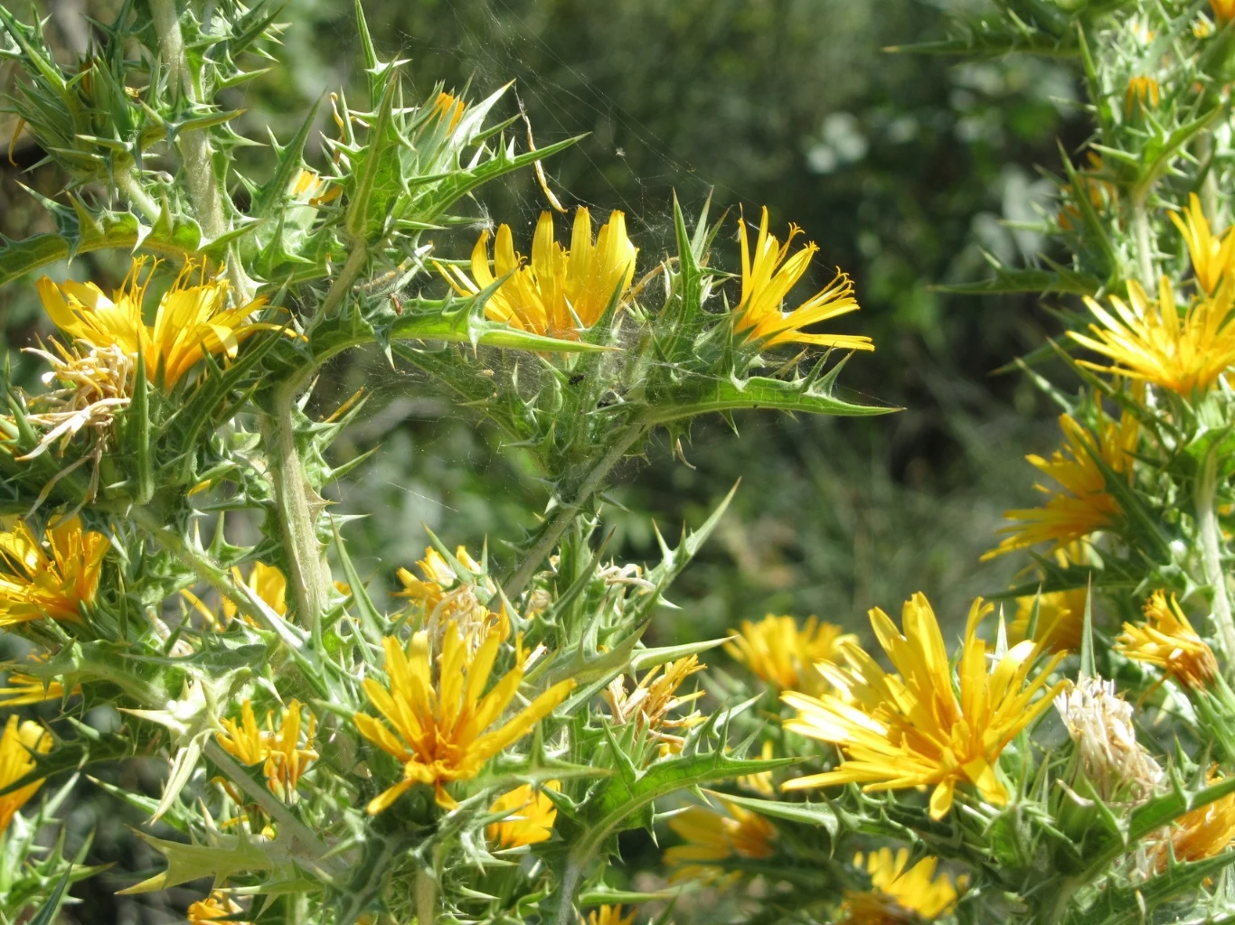 System korzeniowy jest palowy, silnie rozwinięty, sięgający na głębokość 50-80 cm. Łodyga jest prosta, wzniesiona, wyraźnie bruzdowana, zielonkawobrązowa, w górnej części rozgałęziona, pokryta ostrymi kolcami o długości 3-8 mm.