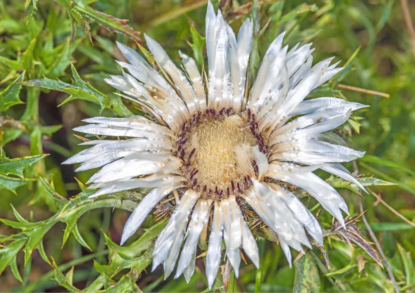 Pierzaste liście dziewięćsiła mają charakterystyczne, kolczaste zakończenie. Pojedyncze liście tworzą rozetę, która może osiągnąć do 15 cm średnicy. Kwiat wyrasta ze środka rozety. Ma duży rozmiar – może dorastać do 7-15 cm średnicy. Uzyskuje barwę srebrzystobiałą, ciekawie kontrastując z zielonymi liśćmi.