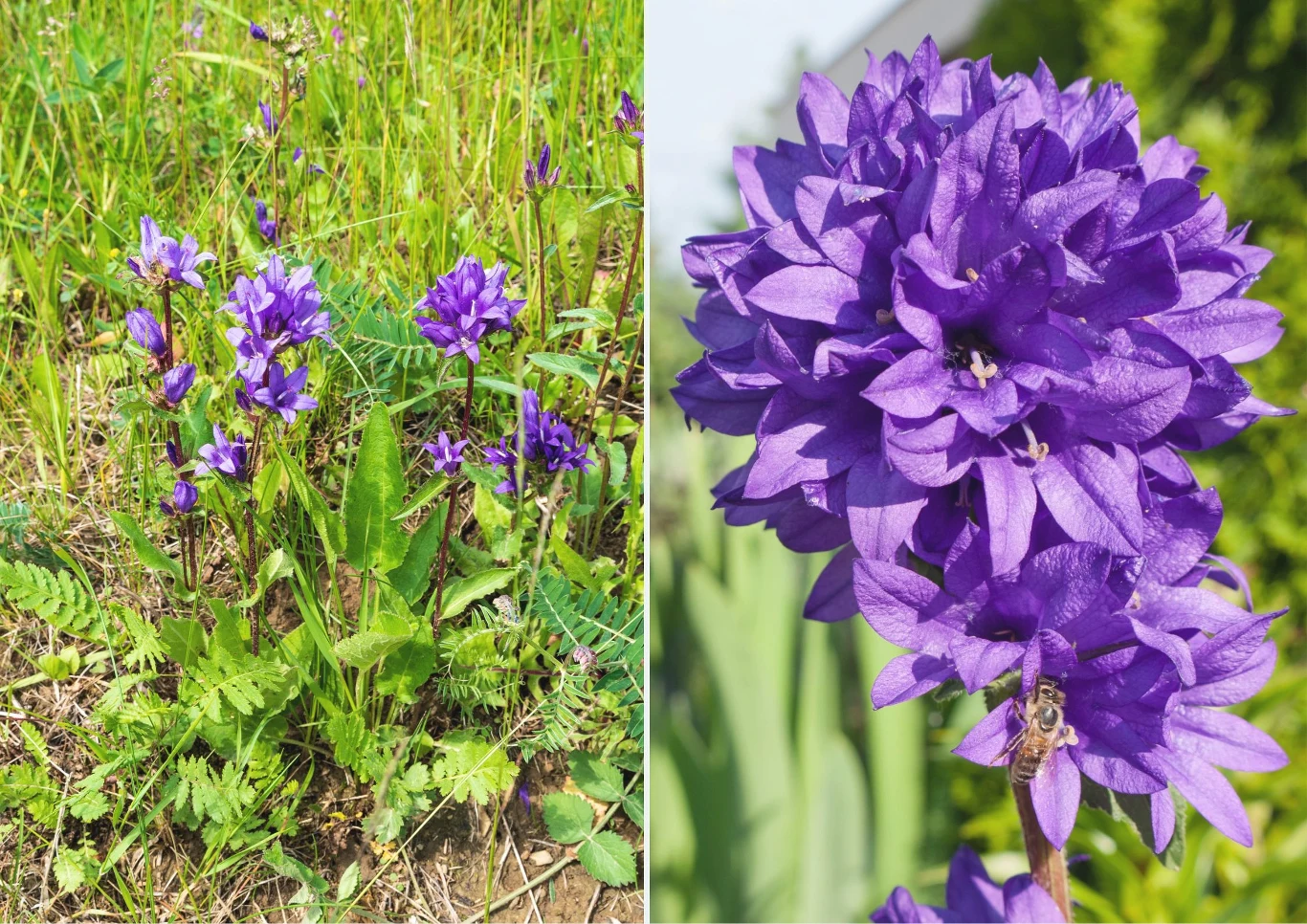 Dzwonek skupiony (Campanula glomerata) występuje w Polsce jako gatunek rodzimy. Jego kwiaty zebrane są w kuliste kwiatostany na szczycie sztywnych, owłosionych łodyg. Najczęściej mają kolor fioletowy. Roślina kwitnie na przełomie czerwca i lipca. Kwiaty utrzymują się krótko. W sprzyjających warunkach dzwonek skupiony powtarza kwitnienie jesienią.