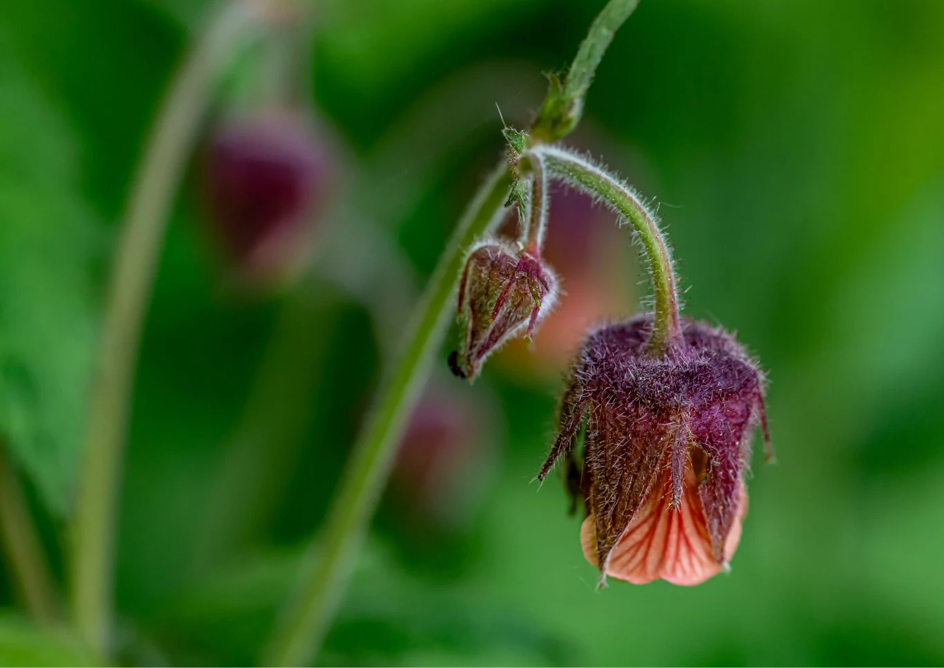 Wyprostowane, omszone łodygi mają czerwone zabarwienie. Na ich szczycie pojawiają się zwisające, dzwonkowate kwiatostany z płatkami w kolorze czerwonobrunatnym i żółto kremowym wnętrzu. Kwiaty pojawiają się już pod koniec kwietnia i utrzymują do końca maja. Po przekwitnieniu na ich miejscu zawiązują się puszyste owocostany, dzięki którym krzew pozostaje dekoracyjny przez cały sezon.