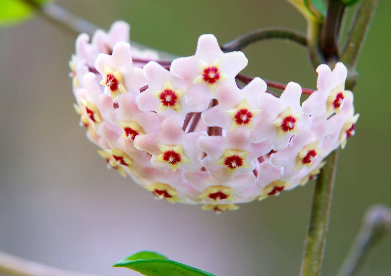 Szypułkowe kwiaty hoya carnosa wyglądają jak 2 nałożone na siebie gwiazdy. Są one aromatyczne i wydzielają wabiący owady słodki nektar.