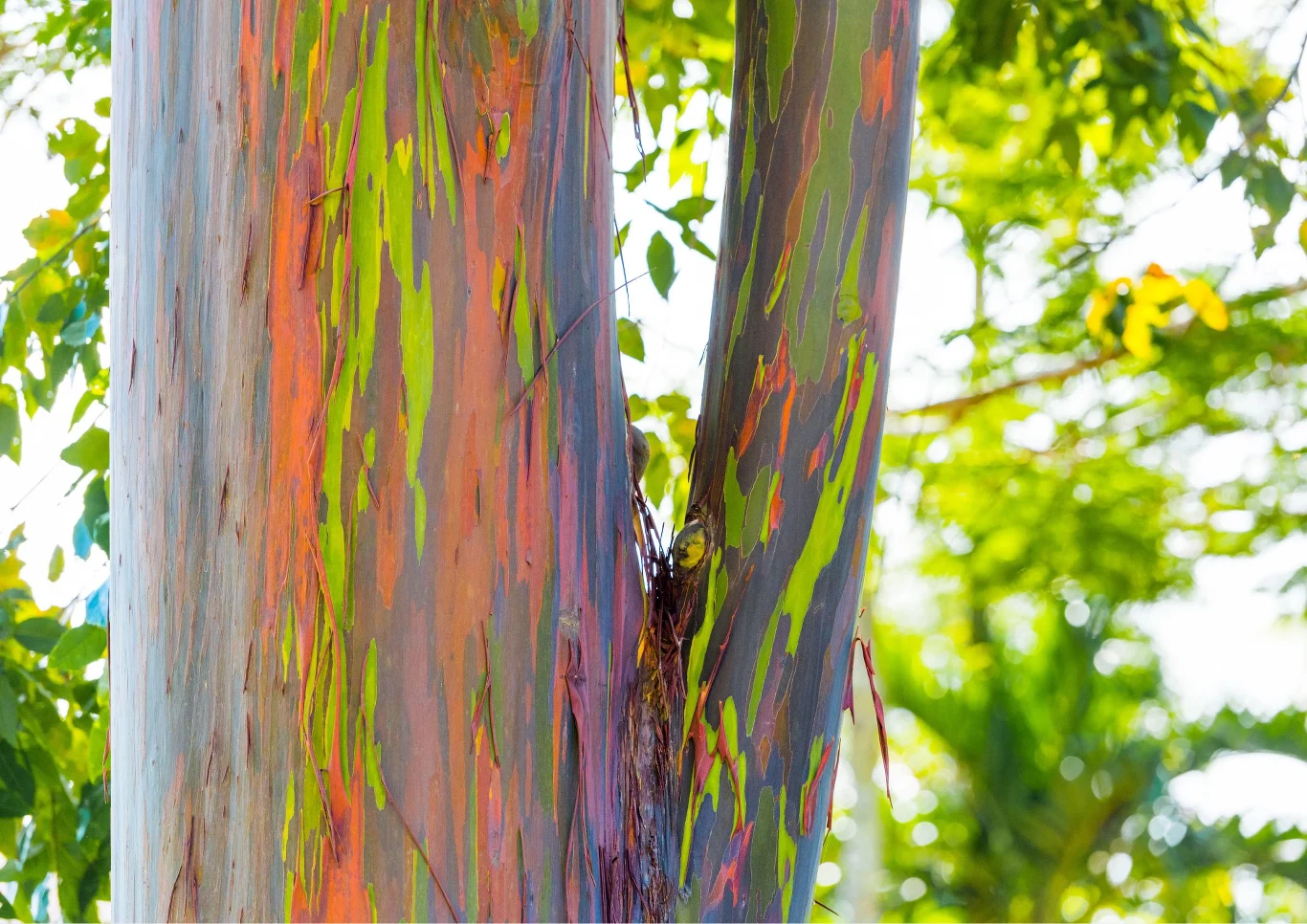 Niesamowity, bajkowy, dziwny, zachwycający – każde z tych określeń pasuje do tego gatunku i żadne nie będzie przesadą. Wystarczy spojrzeć na zdjęcia z tropików, aby się o tym przekonać. Najbardziej efektownym elementem eukaliptusa tęczowego jest pień, który wygląda jak oblany farbą lub upiększony w programie graficznym. Tęczowy efekt jest zasługą nierównomiernie złuszczającej się kory. Odkryte płaty kory z czasem ulegają przebarwieniom: najpierw są mocno zielone, później niebieskie, fioletowe, czerwone i na końcu brązowe.
