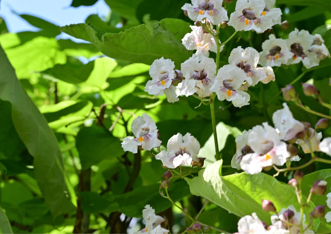 Oprócz wyjątkowych liści katalpa ozdobna jest także z pięknych kwiatów. Kwiatostany są wiechowate i bardzo okazałe, pojawiają się latem – od lipca do sierpnia. Zakwita od chwili, kiedy urośnie na 3 metry – taką wysokość osiąga zazwyczaj po kilku latach hodowania. Wiechy o wysokości 20-30 cm tworzą białe kwiatki z żółtą i czerwoną plamką wewnątrz. Charakteryzuje je dzwonkowaty kształt. Płatki na koronie są delikatne, subtelnie nakrapiane fioletem. Surmia zwyczajna jest niewątpliwie zwyczajna tylko z nazwy.