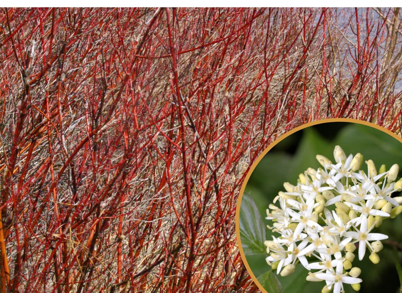 Dereń biały to krzew dorastający do około 3 m wysokości. Jego cechą charakterystyczną są pędy w kolorze czerwonym. Zdobią ogród przez cały rok, również zimą. Roślina ma drobne, białe kwiaty. Jej owoce nadają się do spożycia.