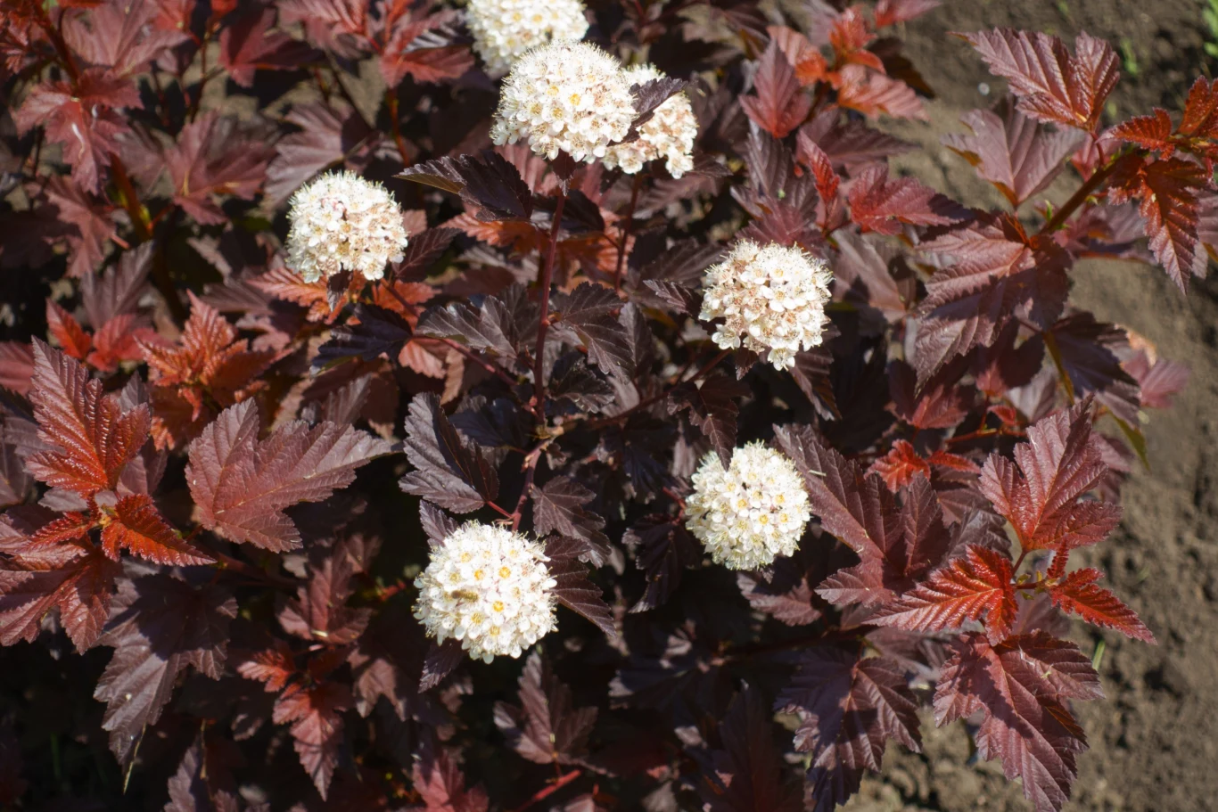 - Diabolo – krzew z pędami w kolorze mahoniowo-brązowym, lśniącymi liśćmi zachowanymi w odcieniu ciemnej czerwieni oraz kremowobiałymi kwiatostanami.