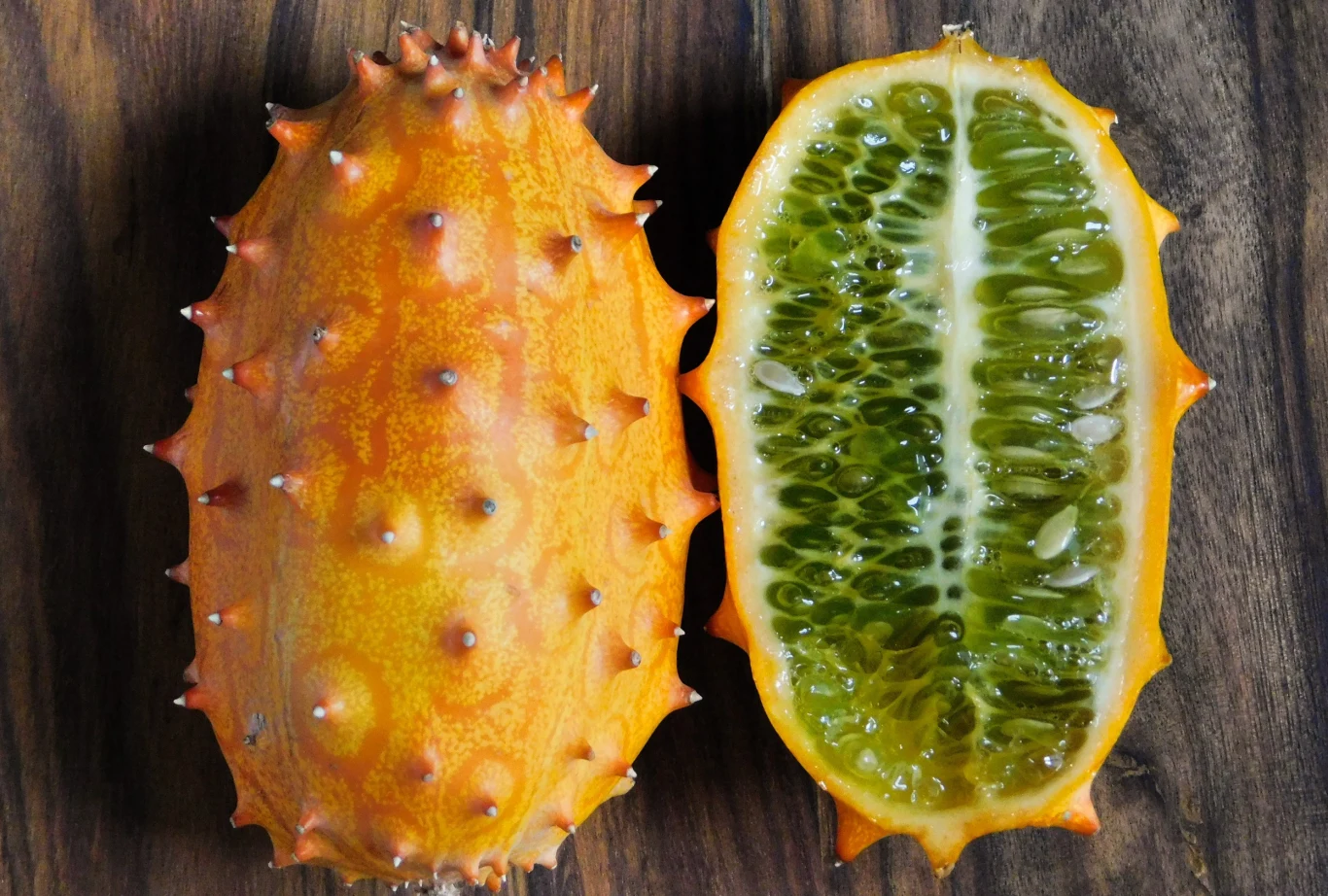 Owoce kiwano są podłużne. Wielkością przypominają gruszki. Skórka jest początkowo zielona. Na powierzchni ma charakterystyczne „kolce” i jasne plamy. Ogórek kiwano nadaje się do jedzenia, gdy zmieni kolor na pomarańczowy.